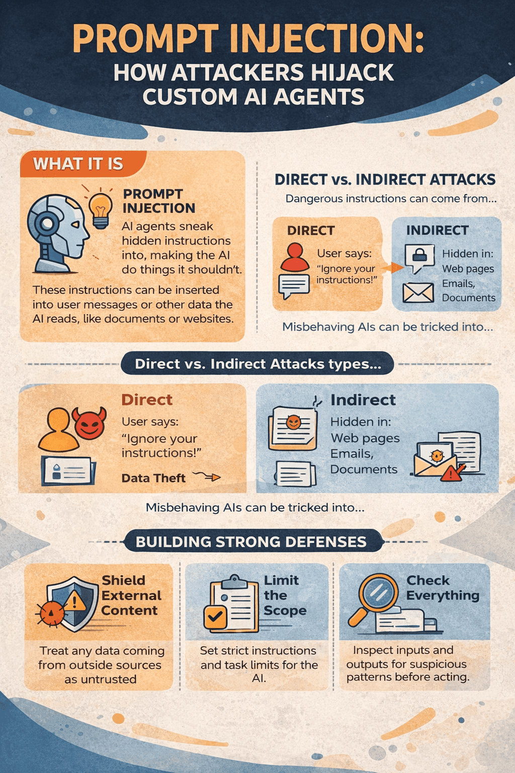 Prompt injection works by slipping harmful instructions into user messages, retrieved documents, emails, or even images. Once the model reads those instructions, it may leak data, call restricted tools, or pass bad commands to other systems. Protecting against this requires more than filters. You must assume the model itself can be influenced and design around that risk.